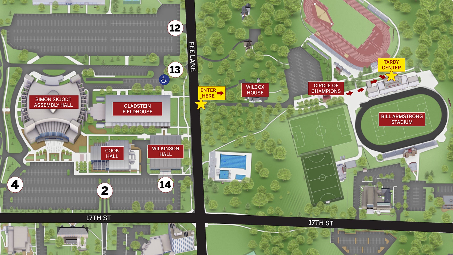 Guests with accessibility needs can be dropped off near the main ticket gate at Bill Armstrong Stadium off Fee Lane. Vehicles can park in Gates 13 or 14 in the IU Athletics parking lots after drop-off (or any of the other listed gates).